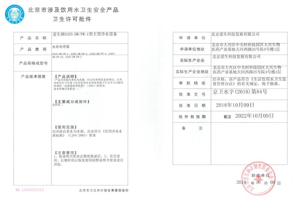 20188月底,愛生在長達十個月準(zhǔn)備的新一期衛(wèi)生批件申請,一次通過北京疾控中心組織的專家上會評審,產(chǎn)品及能力均獲專家首肯;201811月,經(jīng)北京市衛(wèi)生和計劃生育委員會批準(zhǔn),愛生拿到了第5張批件許可,成為北京地區(qū)為數(shù)不多的具備大型直飲水設(shè)備制造能力的專業(yè)企業(yè)。